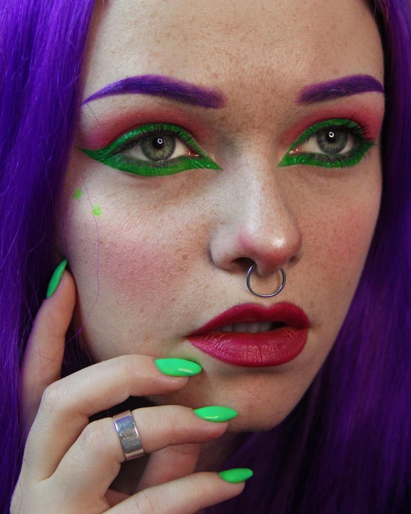 Для макияжа e-girl подойдут самые необычные оттенки. Если у вас завалялась палетка с цветами, которые вы не использовали, сейчас самое время. Возьмите кислотно-розовые, желтые и синие оттенки, пригодятся также фиолетовые. Вы можете использовать одно средство для того, чтобы подчеркнуть глаза и добавить яркий румянец, или попробовать сочетать два оттенка — один на щеках, другой на веках.