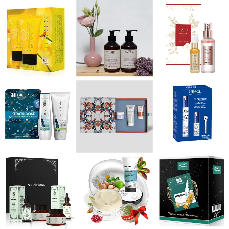 На фото (сверху слева направо): Ароматический баттер Eden Breeze, Thann; Восстанавливающий уход для волос, AlterEgo Italy (питательный шампунь и маска для сухих волос); Подарочный набор по уходу за кожей, d’Alba (интенсивная спрей-сыворотка и успокаивающая спрей-сыворотка); Профессиональный уход Keratindose для поврежденных волос, Biolage (шампунь и кондиционер); Лимитированный набор «Время для себя», [ comfort zone ] (увлажняющий крем для лица Hydtamemory, ультраувлажняющий крем для рук Specialist, укрепляющий крем для тела Strategist D-Age); Набор Age Protect, Uriage (многофункциональный дневной крем, многофункциональный крем для кожи контура глаз и массажер для контура глаз); Подарочный набор антивозрастной косметики для лица с ретинолом, Verifique (крем для лица, сыворотка, маска с ретинолом 1% и сыворотка с ретинолом 0,4%); Ультраувлажняющий набор для тела, Lifecode (увлажняющий крем для тела, крем для рук, бомбочка для ванны); Подарочный набор «Исполнение желаний», MartiDerm (сыворотка в ампулах Platinum Photo-Age HA+ 5х2 мл, экспресс-уход The Originals Flash в ампуле 1х2 мл, маска увлажняющая The Originals)
