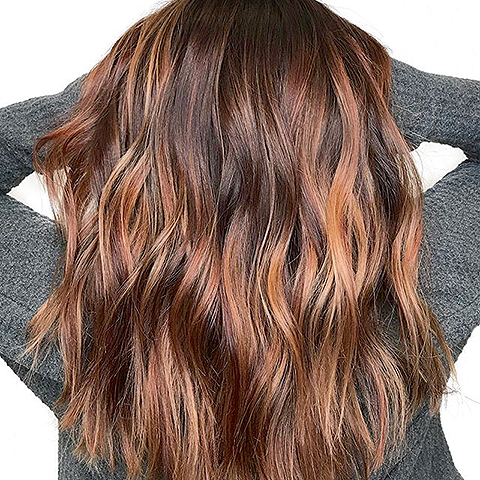 Здесь ничего нового не придумали: это балаяж, который перекрывают карамельными оттенками. Такой вариант подойдет всем девушкам: со смуглой, со светлой кожей — неважно. Какие плюсы? Во-первых, теплые оттенки смягчают черты лица. Во-вторых, такое окрашивание мягко отрастает, не требует постоянной коррекции. Вам даже можно не окрашивать всю массу волос. Если своя база теплая — достаточно осветлить и затонировать отдельные прядки.