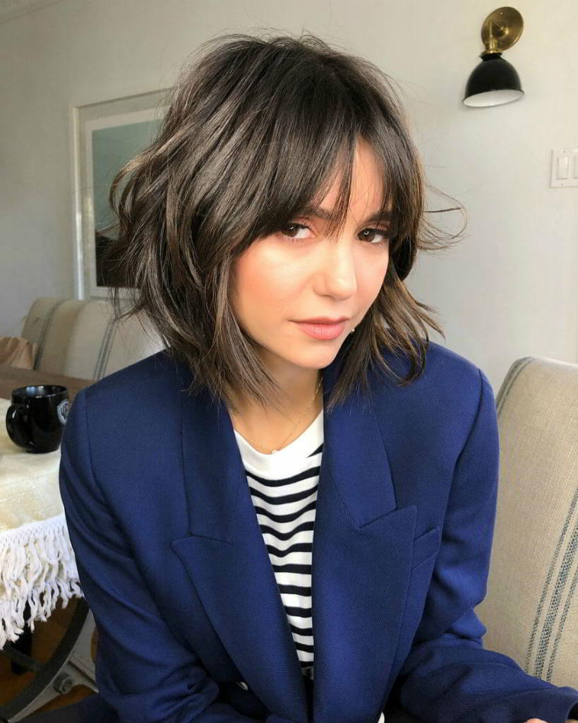 Звезда сериала «Дневники вампира» почти всю жизнь ходила с длинными волосами – казалось, с ее милым лицом никакая стрижка и не нужна. Но Нина решилась отрезать длину до лопаток ради модного боба – и не прогадала! Стрижка сразу превратила милую начинающую актрису в уверенную женщину. Обратите внимание, что у Нины передние пряди длиннее задних, а пряди уложены нарочито небрежно – это делает стрижку современной и придает ей характер.